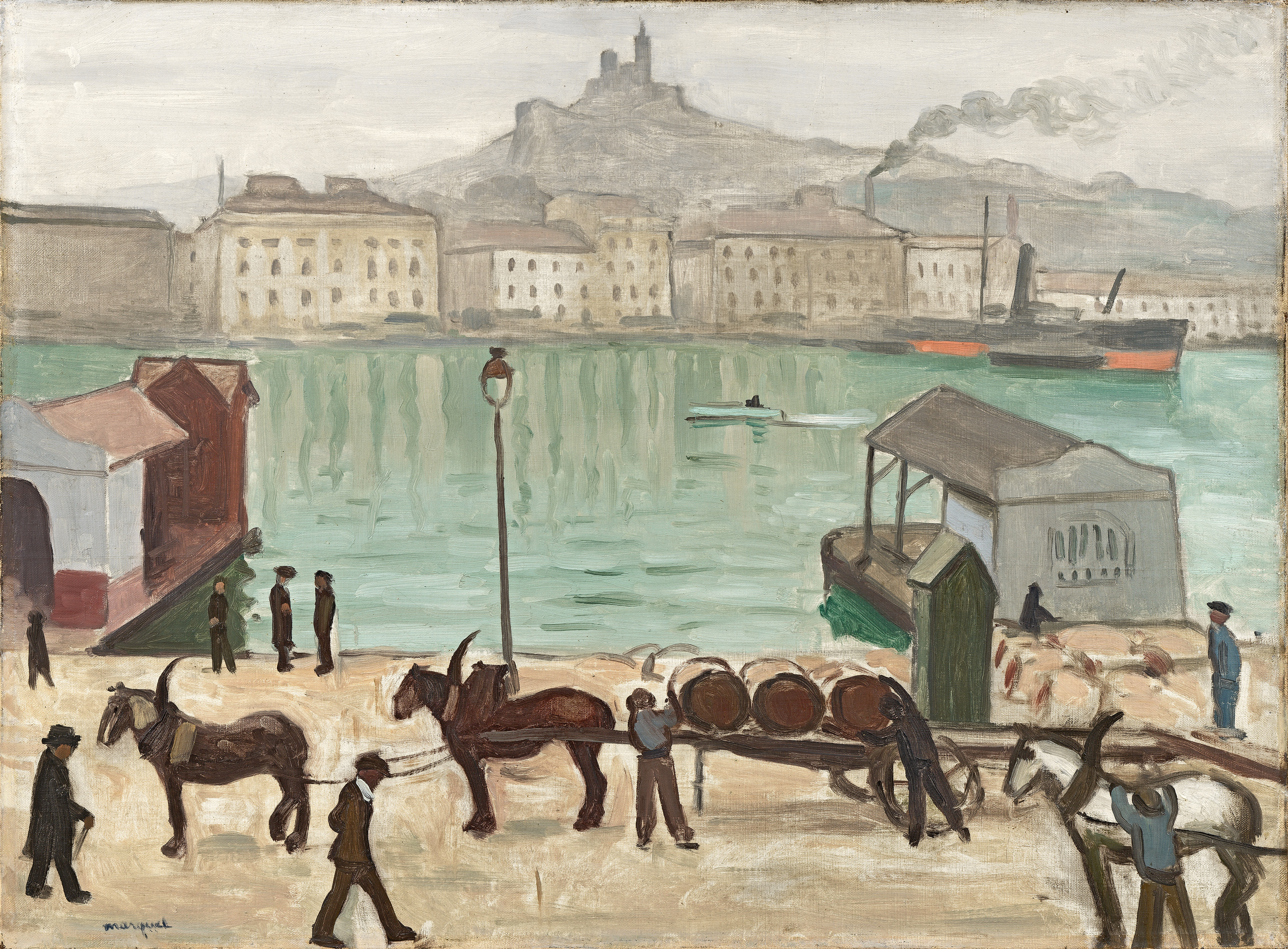 Pendant la Première Guerre, entre la fin de l’année 1915 et 1918, Marquet reviendra dans la cité phocéenne, louant un atelier sur le quai de Rive-Neuve qui domine le port (l’atelier d’Eugène Montfort au 15, quai de Rive- Neuve). De ce point de vue, il peut s’adonner à l’observation d’une vie grouillante, qui s’organise autour du bassin et du fameux pont à transbordeur qui, de sa stature métallique, rythma la vie du port jusqu’à sa des- truction par les allemands pendant la Seconde Guerre. Cependant, la vue que nous présentons est prise du quai opposé, le Quai du port, ouvrant cette trouée sur la colline de Notre-Dame-de-la-Garde. Symbole plus durable de la ville puisque le monument, bien que dégradé, se révélera heureusement à l’épreuve de l’ennemi, la Bonne Mère détache sur le ciel sa silhouette reconnaissable au premier coup d’oeil.